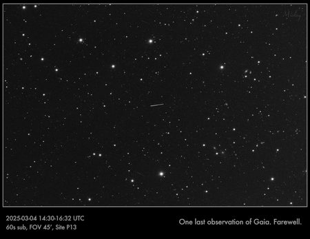 16 décembre 2025. Après plus de 11 ans à balayer le ciel et après l’arrêt des observations scientifiques le 15 janvier 2025, Gaia a été envoyé sur une orbite héliocentrique, loin de la Terre, mais aussi de tout autre vaisseau d’observation de l’Univers orbitant autour du point de Lagrange L2. En effet, Gaia a utilisé la totalité des 55 kg d’azote ayant servi à maintenir son orbite en Lissajous autour de L2 et à assurer la loi de balayage du ciel.